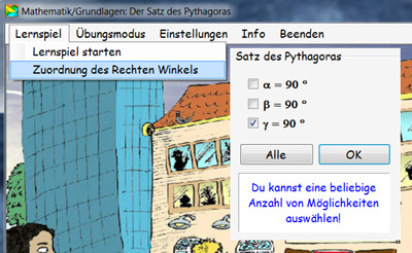 Dabei bietet das Programm zwei Schwierigkeitsgrade an. Im Schwierigkeitsgrade „leicht“ wird die Hypotenuse gesucht, ansonsten kann auch eine Kathete gesucht sein.