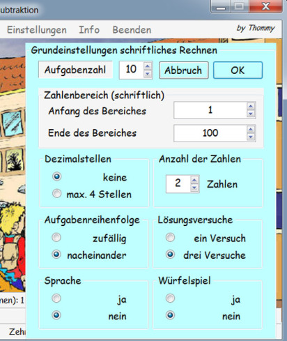 - Zahlenbereich: Der Bereich, in dem sich die Zahlen für die Berechnungen und deren Ergebnisse bewegen, ist beliebig von ( - 100) bis (+ 1000) einstellbar.