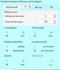 Dieses Lernprogramm ist zum Üben des Halbierens bzw. Ver-doppelns von ganzen Zahlen im Bereich von 1 - 100 in der Grundschule geeignet.