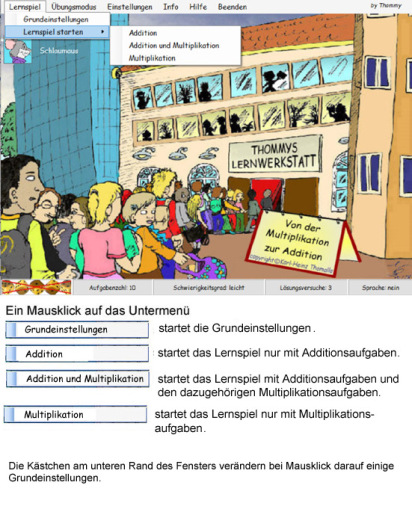 Dieses Lernspiel erklärt den Zusammenhang zwischen Addition und Multiplikation. So wird der Lernende spielerisch und auf sehr anschauliche Art und Weise in die Multiplikation im Zahlenbereich von