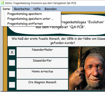 Mit dem Lernprogramm mitgeliefert werden eine Anzahl Fragenkataloge aus den Bereichen Deutsch, Mathematik, Englisch, PCB u.a. Diese Fragenkataloge enthalten den Lernstoff, der den Richtlinien des bayerischen Lehrplanes entspricht, in Form von Lückentexten, Zuordnungen und Fragen im Multiple-Choice-Format. Jeder Anwender kann mit Hilfe des eingebauten Editors jeden dieser Fragenkataloge durch Löschen, Hinzufügen oder Ändern von Fragen seinen Erfordernissen anpassen. Natürlich können auch neue Fragenkataloge mit beliebigem Inhalt erstellt werden. Der Editor ist zu bedienen wie ein Textverarbeitungsprogramm. Den Fragen können auch Grafiken (*.jpg) hinzugefügt werden.