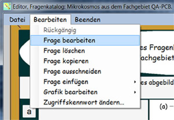 Somit ist es möglich, eine beliebige Frage zu löschen, zu ändern, in den internen Speicher zu kopieren, auszuschneiden (d.h. in den internen Speicher kopieren und löschen), eine neue Frage oder den Inhalt des Zwischenspeichers an einer beliebigen Stelle einzufügen. Es ist weiterhin möglich, einer beliebigen Frage eine Grafik beizufügen. Eine bereits vorhandene Grafik kann wieder aus der Frage entfernt werden.